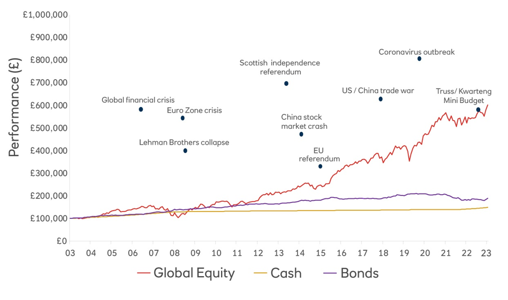 The below graph from NatWest covering the period between 2003 and 2023 highlights this, showing the return on global equities (shares), bonds, and cash at critical points in history. Although cash remains relatively level, the eventual returns from bonds and equities would have been higher.